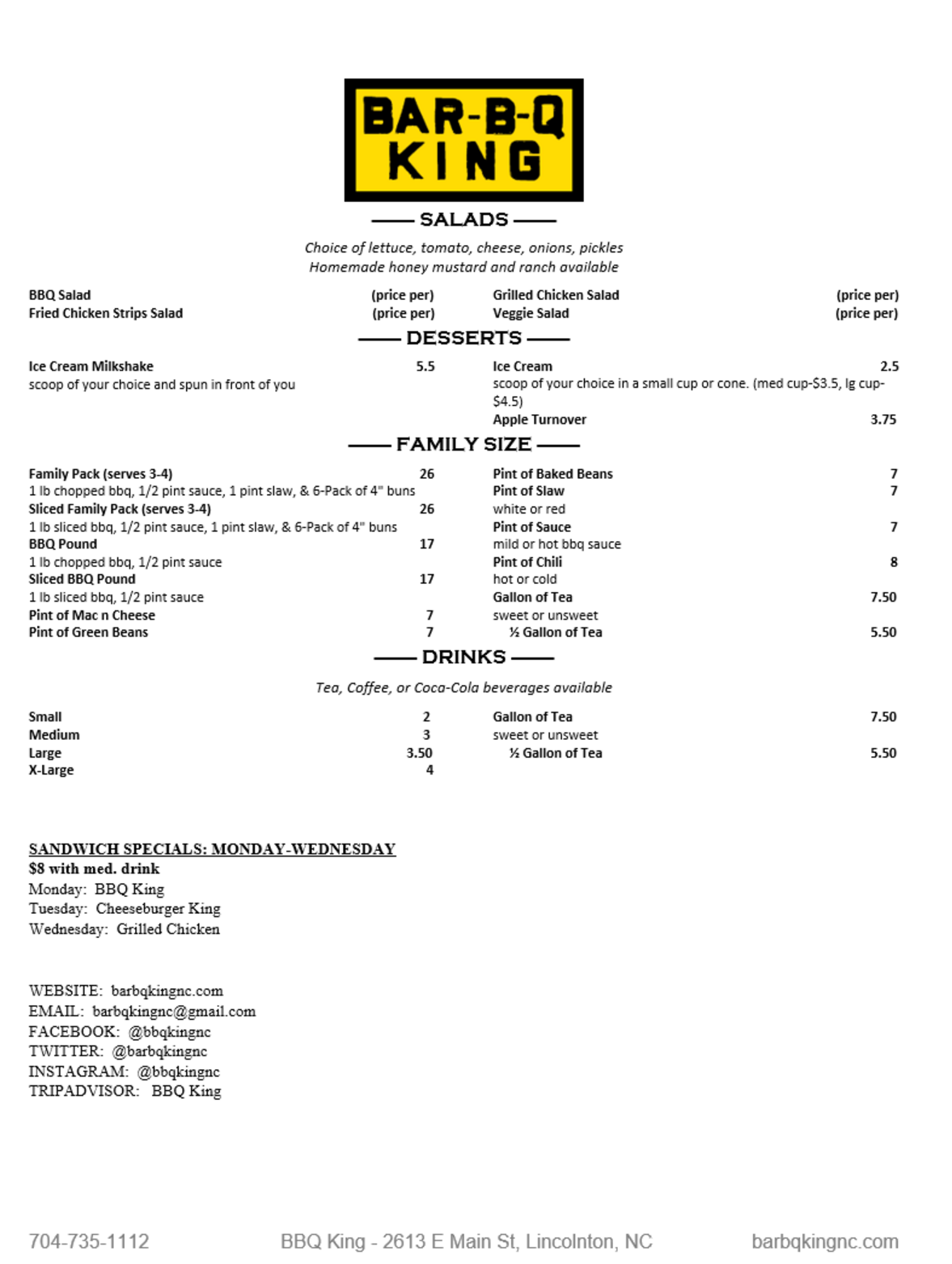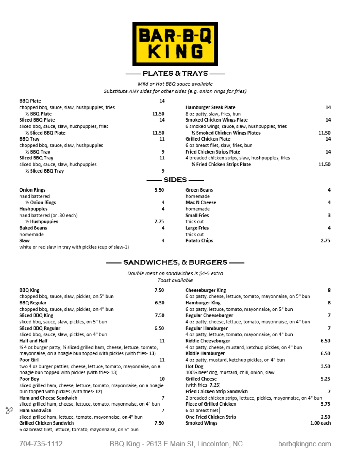 Our barbecue is fresh pit smoked over hickory wood coals and hand chopped every morning. We hand patty our burgers with the highest quality ground chuck and slice our ham fresh daily. Whether you want a Poor Girl, Half & Half, or the house favorite Cheeseburger King prepared hotdog style, we are sure there is something on the menu for you! Our food is delivered and prepared fresh daily all the way down to our chicken, slaws, onion rings, pound cakes, and tea;)